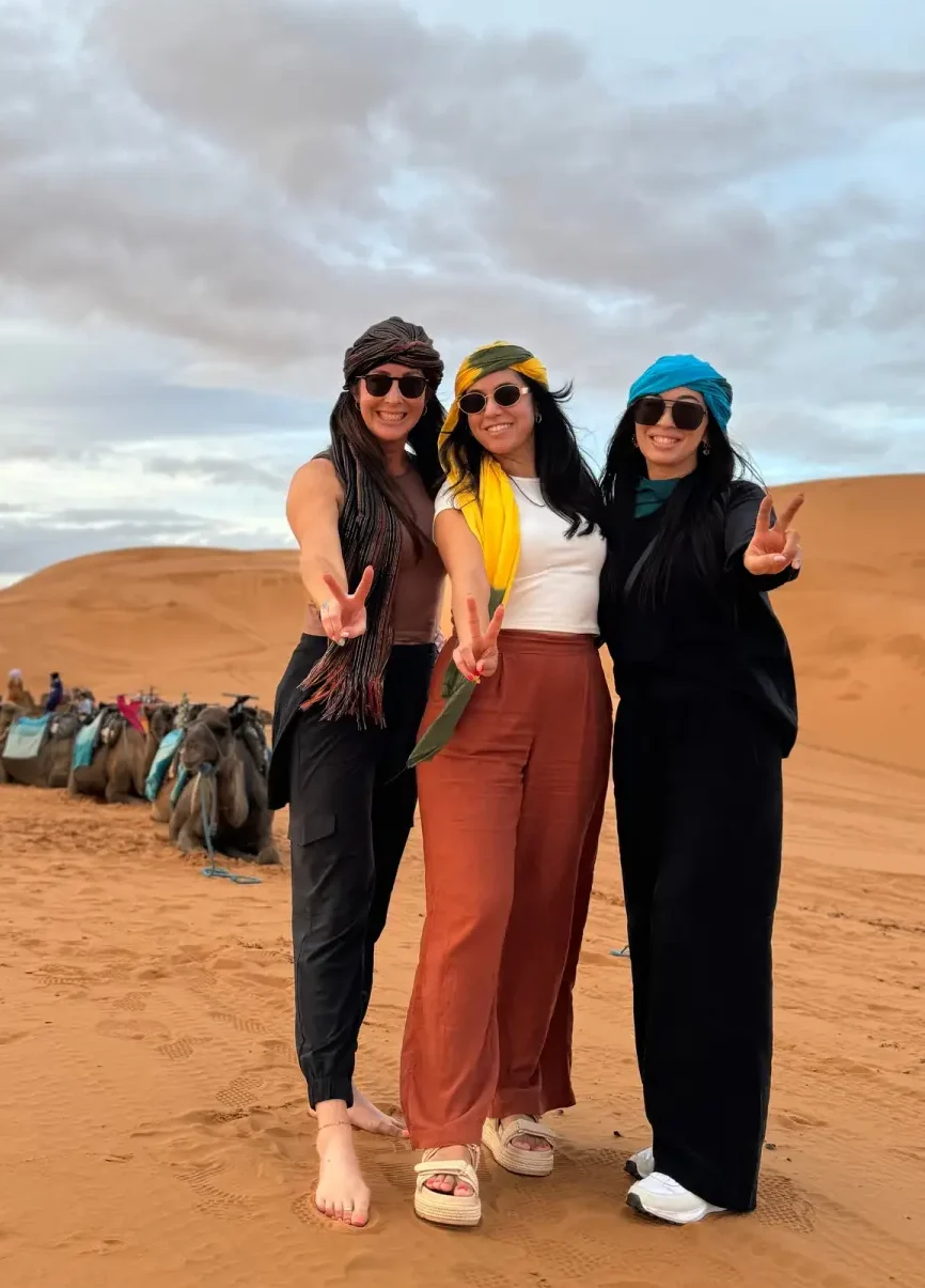 This 3-day private Morocco Desert Tour departs from Fes and ends at your accommodation in Marrakech, tracing a classic southern route through the heart of the country. Traveling southeast through the Middle Atlas — past Ifrane, the cedar forests of Azrou, and Midelt — you’ll reach the golden dunes of the Merzouga Sahara Desert for a sunset camel trek and a night in a luxury air-conditioned desert camp, before heading west through Khamlia, Todra Gorge, Dades Valley, Kalaat M’Gouna’s rose valley, Skoura, Ouarzazate’s film studios, and the UNESCO-listed Ait Ben Haddou Kasbah, and finally crossing the High Atlas via Tizi n’Tichka to arrive in Marrakech. The tour includes a comfortable private vehicle, English-speaking driver, accommodation in a desert camp and a Kasbah hotel, and dinners and breakfasts at accommodations.